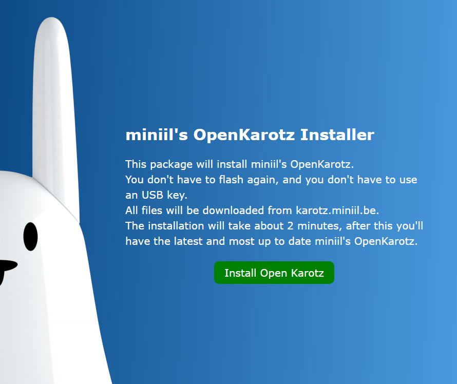 La deuxième page vous informe sur l'installation, cliquez sur le bouton pour installer miniil's OpenKarotz et suivez la progression.