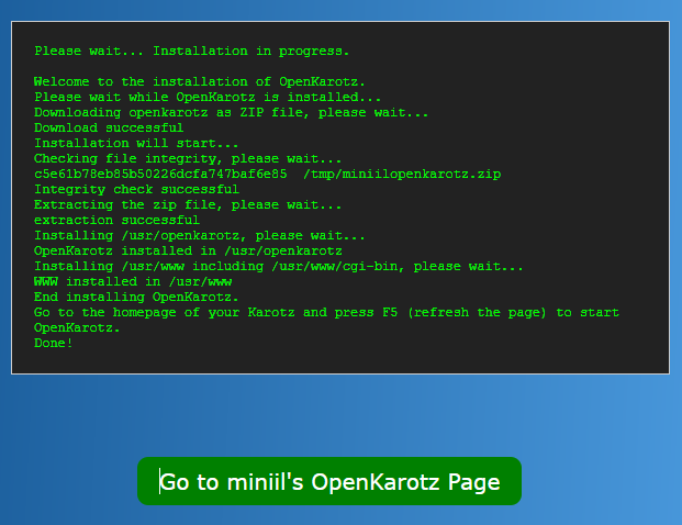 • Copie des fichiers d'installation pour miniil's OpenKarotz.  Il s'agit du fichier archive installpage.zip qui sera d'abord copiée dans le répertoire /tmp du lapin et extrait dans le répertoire /usr/www