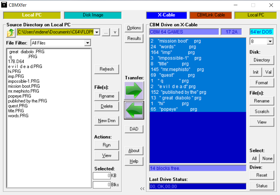 Une fois le driver installé j'ai pu utiliser CBMXfer (créé par Steve J. Gray), une interface graphique, pour lire ma disquette, en faire une image d64 (qui pourrait être utilisée sur un émulateur comme VICE) et sauvegarder les fichiers sur le disque dur de mon ordinateur.